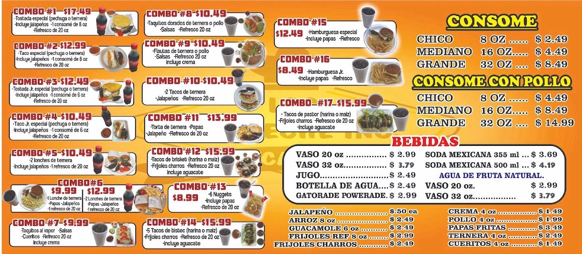 The menu boasts a delightful array of combinations that perfectly balance taste and value. For example, their COMBO #1 features a delicious Tostada especial with your choice of pechuga or ternera, complemented by jalapeños, a hearty 8 oz consome, and a refreshing 20 oz soda, all for just $17.49. Or opt for the COMBO #2, which is a favorite among locals, featuring a taco special that promises to satisfy any craving. At $12.99, it’s an unbeatable deal!
